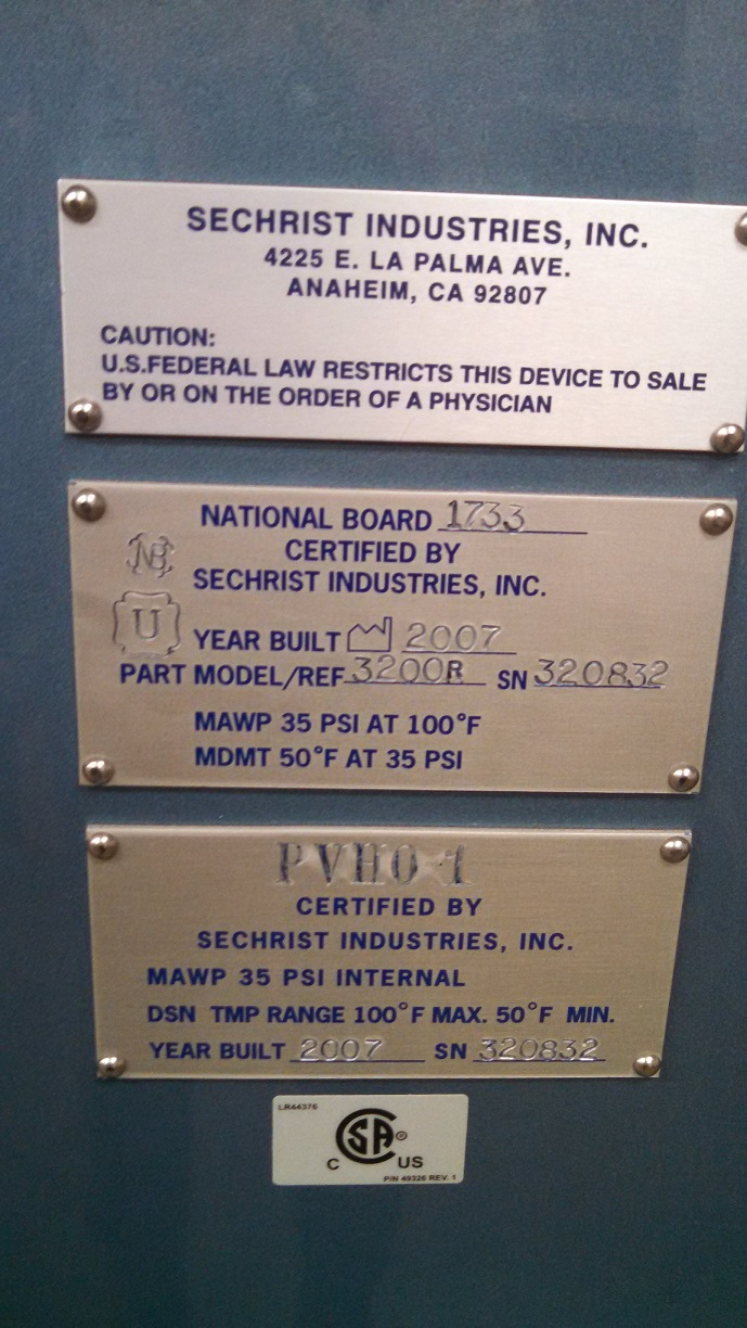 For sale is a 2007 Sechrist 3200R Hyperbaric Chamber. This unit is in excellent condition after having recently been refurbished and reconditioned by Sechrist and has a low cycle count of 5578. A patient gurney with a deluxe wide stretcher is included. Additional accessories include a patient grounding strap and cord, hoses and adapters for installation and a spare parts kit. For more information, give us a call today, and one of our representatives will be able to further assist you.